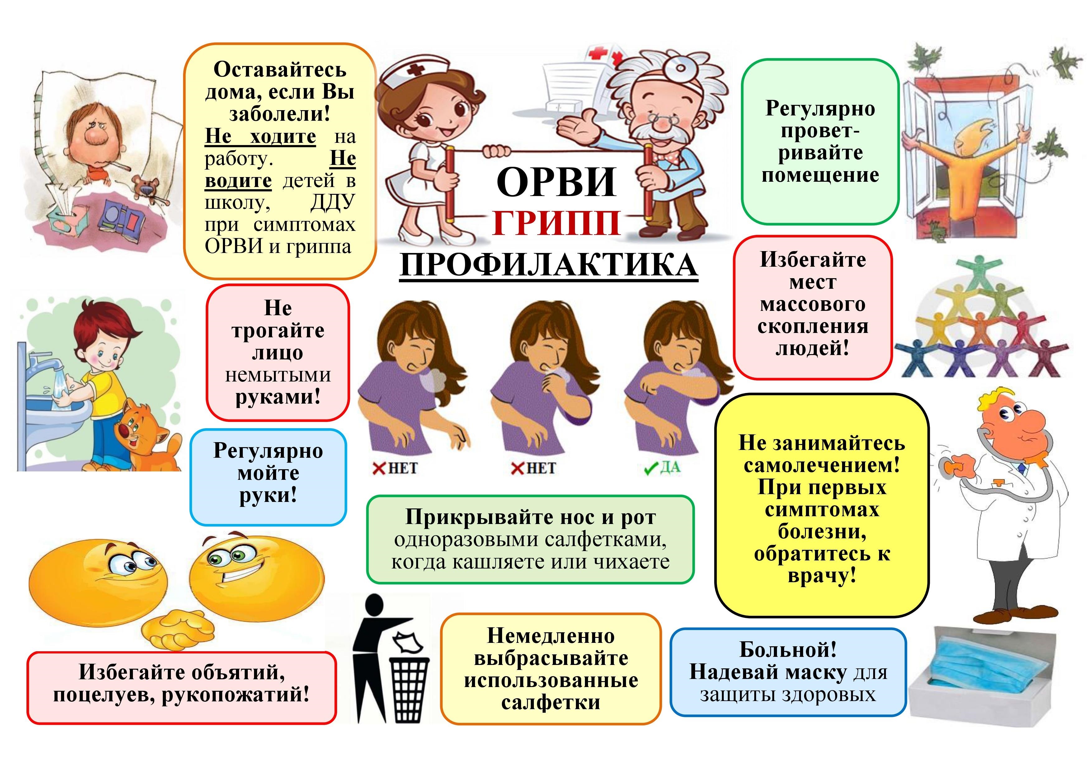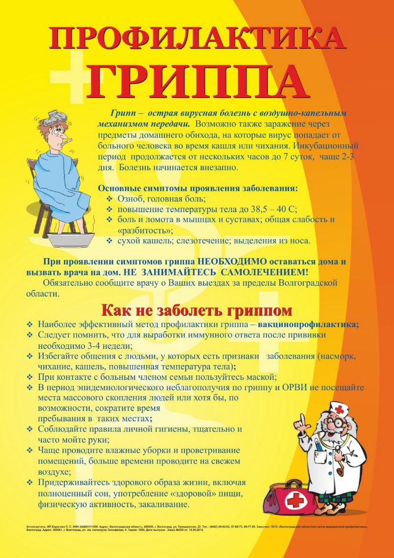 Существует два вида профилактики гриппа и ОРВИ: это специфическая профилактика (вакцинация) и неспецифическая, подразумевающая под собой соблюдение правил личной и общественной гигиены. Для организованных детских коллективов наиболее эффективной в осенний период до начала сезонного подъема заболеваемости является вакцинация против гриппа групп риска, к которым относятся: дети старше 6 месяцев, дети, посещающие дошкольные образовательные организации и (или) находящиеся в организациях с постоянным пребыванием (детские дома, дома ребенка), школьники, работники учебных заведений.